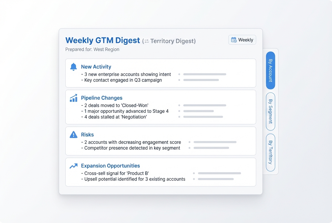 For QBRs, renewal reviews, and leadership updates, Clones assemble draft decks and briefs that include usage trends, value delivered, open issues, roadmap updates, and proposed next steps. They pull from CRM, product analytics, tickets, and meeting notes—giving GTM leaders an 80%‑complete starting point instead of a blank slide.